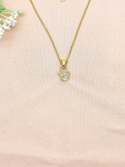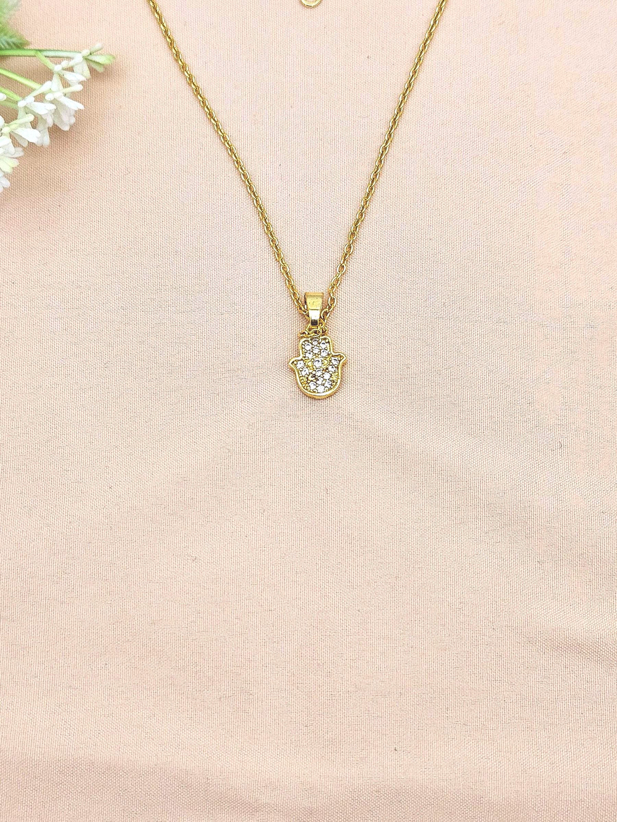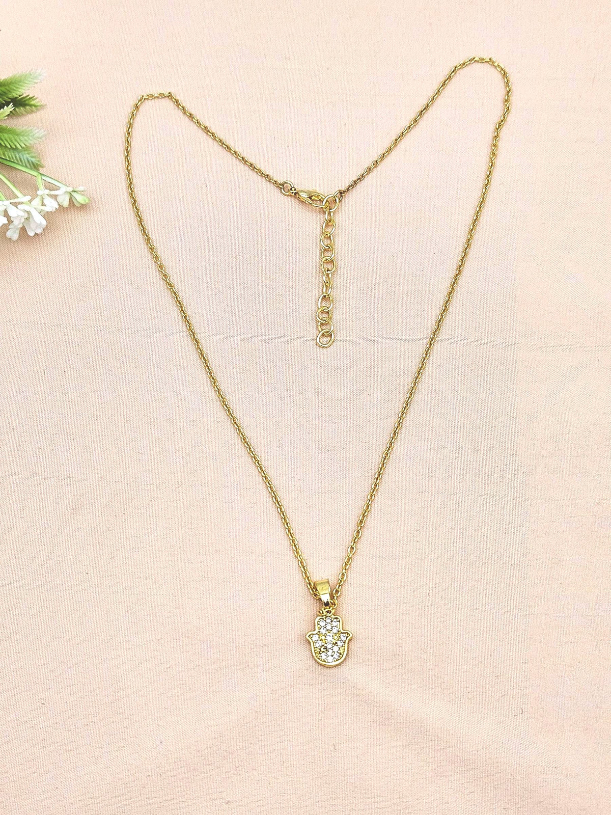 Beautiful Gold plated Cubic Zirconia Stone Light weight Hand Palm Shape Chain Pendant for women are made of Brass alloy. The Chain Pendant Drop length is 25.4 cm & the weight is 4.62 Gram. Pendant length & width is 2.1 cm & 1.0 cm respectively. The closure lock is Fish Lock.