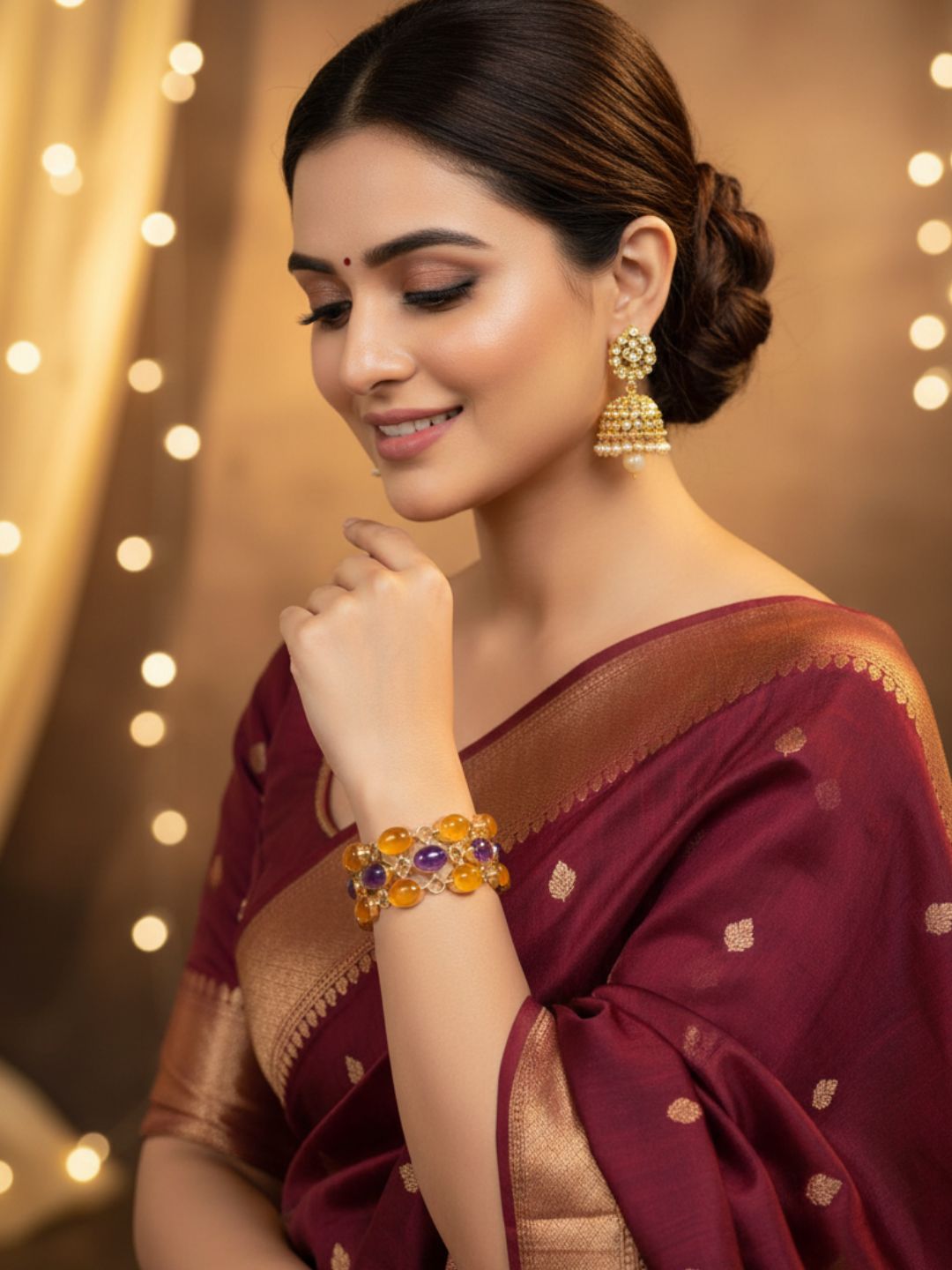 This Amazing yellow chalcedony , Amethyst stone pear openable bracelet is show-stopping and comes in traditional Indian design with gold plating and handwork. Buy this Amazing Semi Precious stone pear openable bracelet and get free shipping .