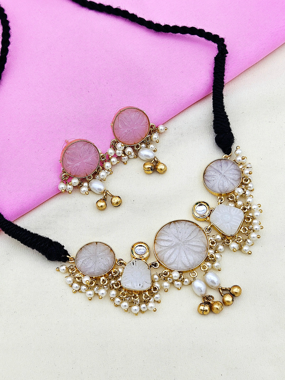 "So beautiful! Antique Gold Plated Synthetic Pearl-Off-white Glass Carving Stone-Faux Kundan Polky Choker Necklace Earring Set for women is made of brass alloy. This unique Gold-plated Brass Cute Designer Necklace-Earring Set is meticulously handcrafted by a Team of skilled Artisan in the heart of India. Simple and comfortable to wear. Eye-catching stylish Necklace & Earring. The Necklace can be combined with a variety of styles and apparel. A great accessory to increase your charm. Good gift for your friends. This is our original Jewelry.