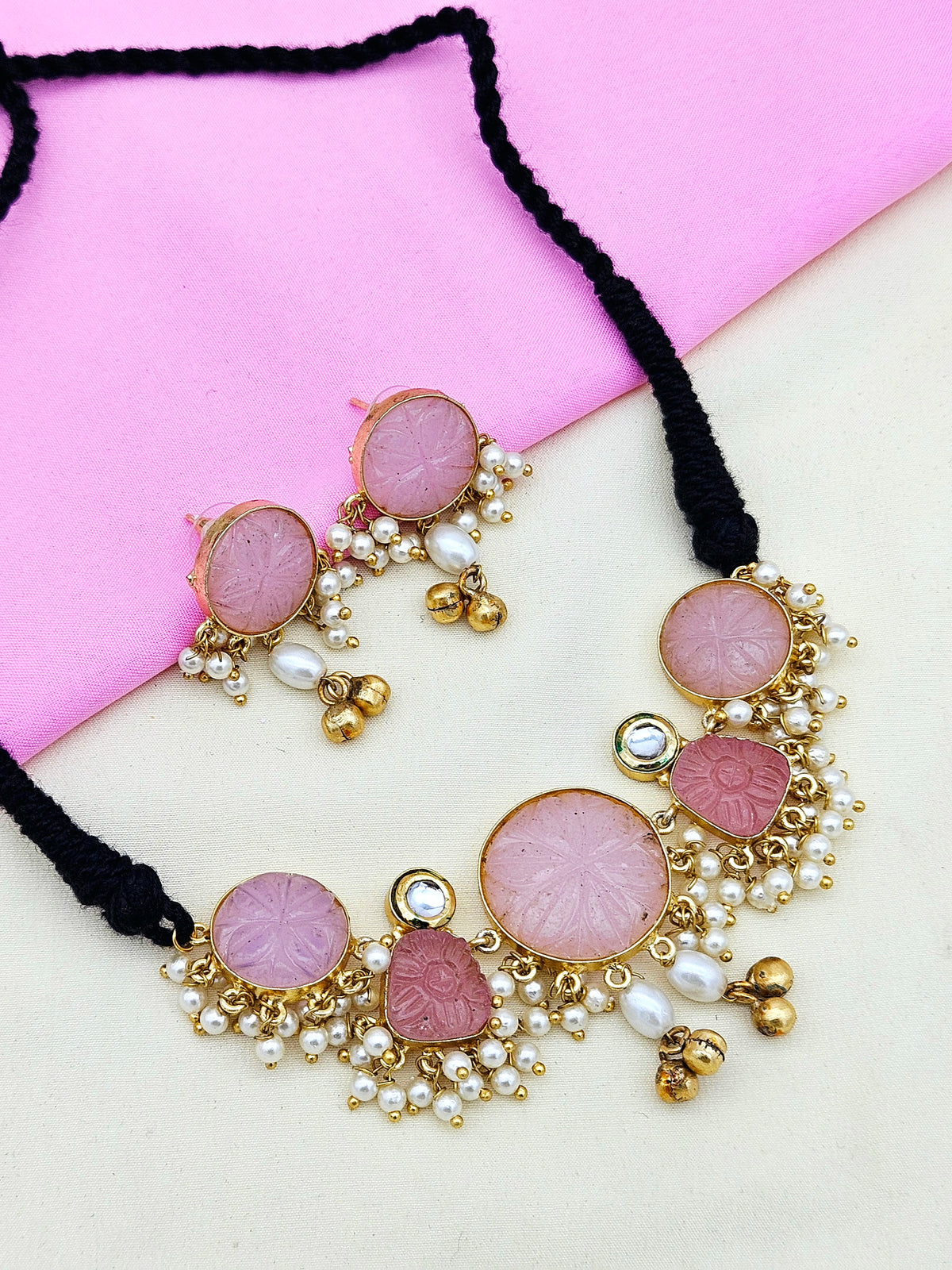 Antique Gold Plated Synthetic Pearl- Pink Glass Carving Stone-Faux Kundan Polky Choker Necklace-Earring Set