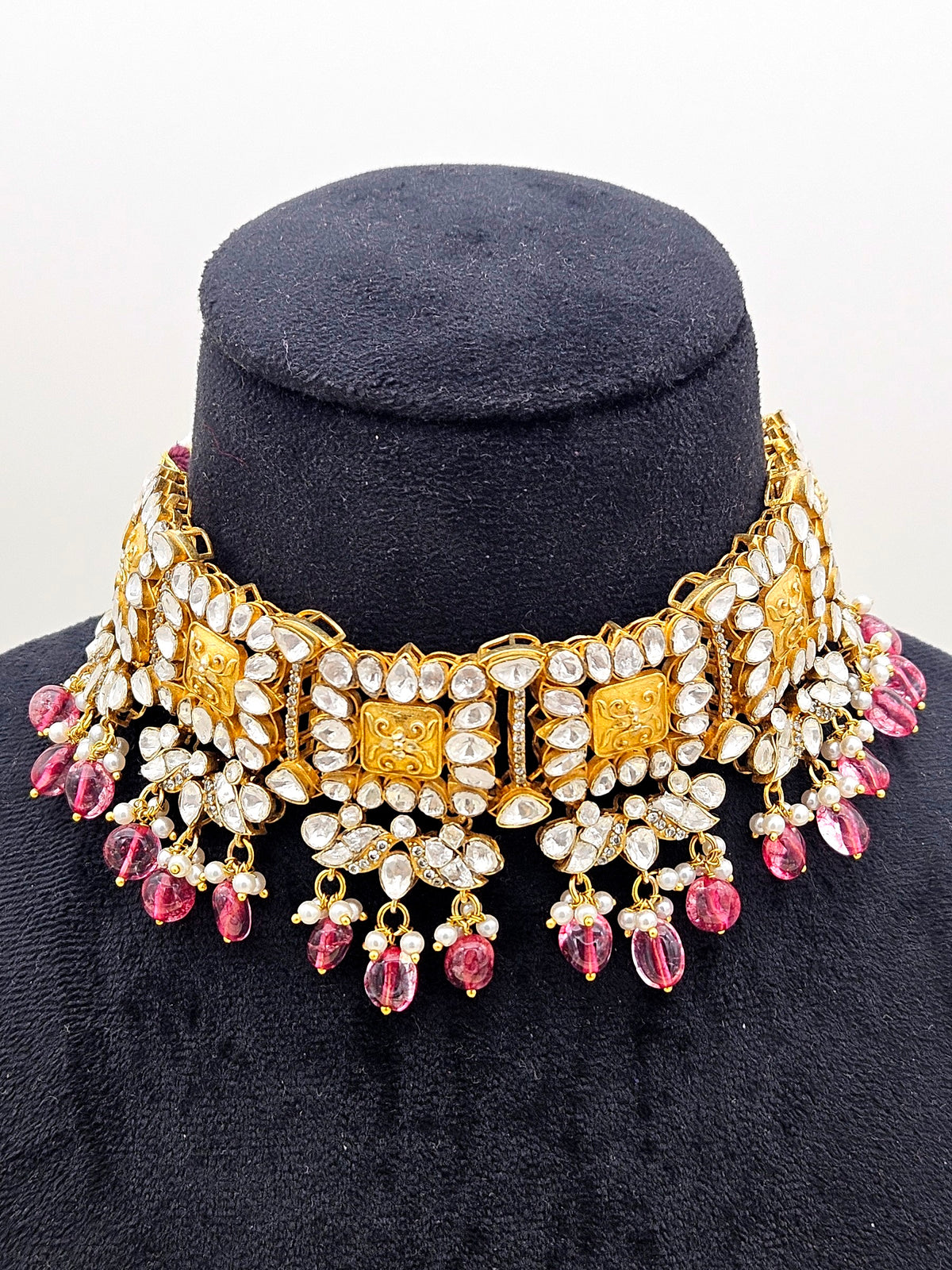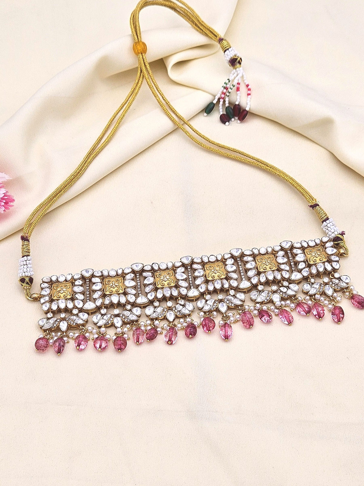 "So Beautiful! Charming Antique Gold plated Synthetic Polki-Red Hydro Quartz Stone Beads Designer Choker Necklace for women is made of brass alloy. The necklace length is 17 cm and is adjustable with drawing string. The necklace weight is 70 Gram with drawing string for closure. This unique Gold-plated Brass Cute Designer Necklace is meticulously handcrafted by a Team of skilled Artisan in the heart of India. Simple and comfortable to wear. Eye-catching stylish Necklace & Earring. The Necklace can be combined with a variety of styles and apparel. A great accessory to increase your charm. Good gift for your friends. This is our original Jewellery.