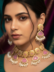 Gorgeous Gold plated - AD- Pink Mona Lisa - Glass Stones & Pearls antique gold Choker Necklace-Earring Set is made of brass alloy. The necklace drop length is 25 cm, Earring Length is 8 cm & width is 4 cm. Necklace -Earring set weight is 171.5 Gram with thread drawing String. The necklace is adjustable as it has a Drawing String.