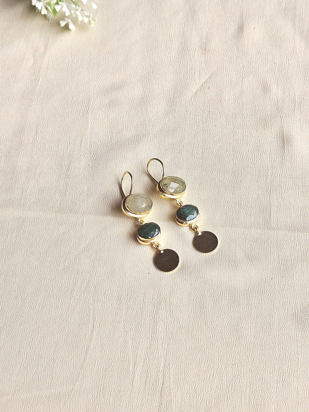 Beautiful Antique Gold Variant Color Gem Stone Light Weight Charming Designer Earring for women are made of brass alloy with gold plating. The earrings length is 5.5 cm and the width is 1.5 cm. The closure lock is Hook. back.