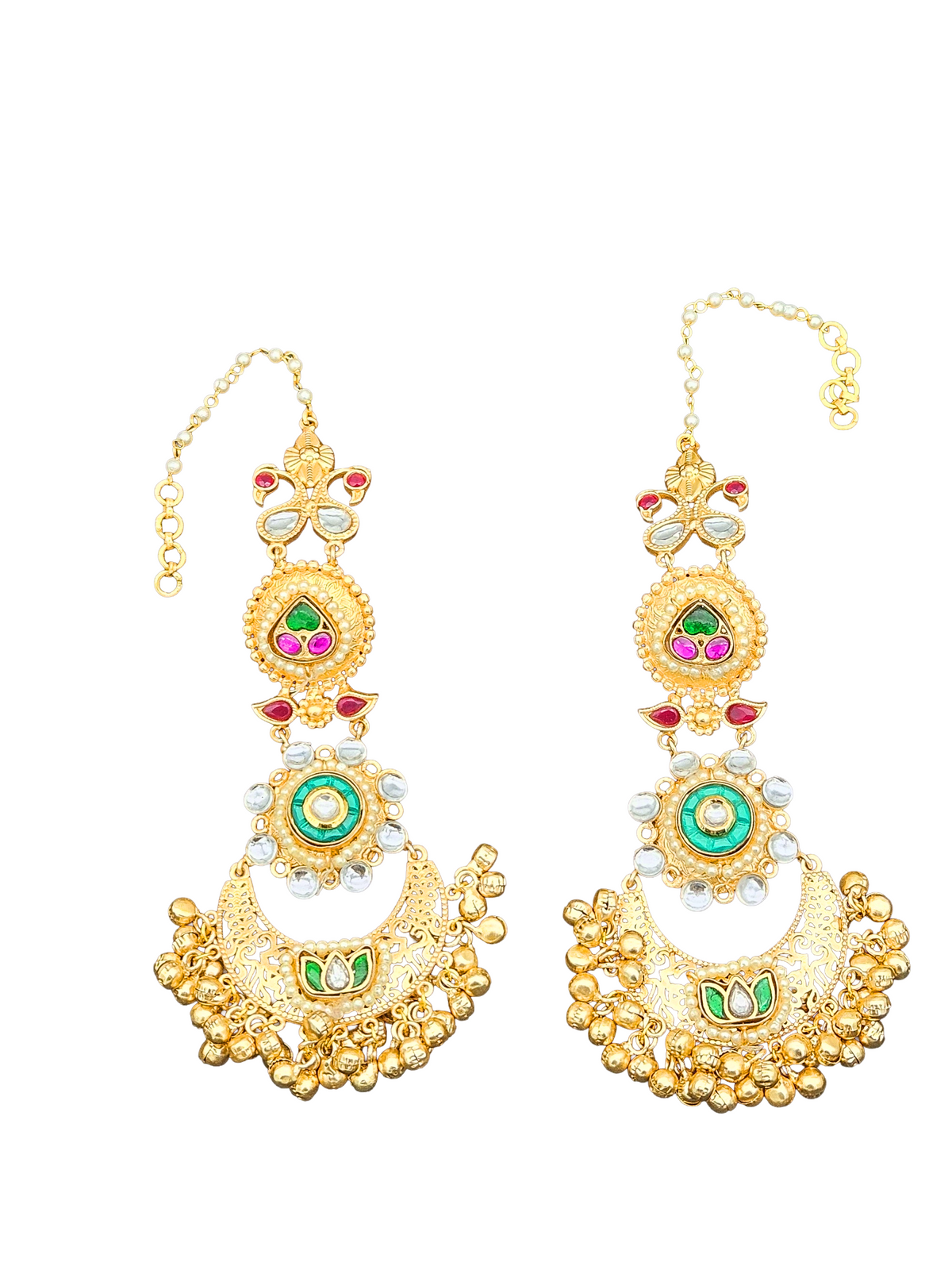 So Beautiful! Elegant Antique Gold Long Kundan-Polky-Green Glass Stone Motif- Pearl Dangle Earrings with Ear Chain for women are made of brass alloy. The Earring length & width is 14.5 cm & 6.5 cm respectively The Earring weight is 75.26 Gram with Push Back closure. This unique Gold-plated Brass Long Cute Designer Earring with Ear-chain are meticulously handcrafted by a Team of skilled Artisan in the heart of India. Simple and comfortable to wear. Eye-catching stylish Earring. The Earrings can be combined with a variety of styles apparel. A great accessory to increase your charm. Good gift for your friends. This is our original Jewellery.