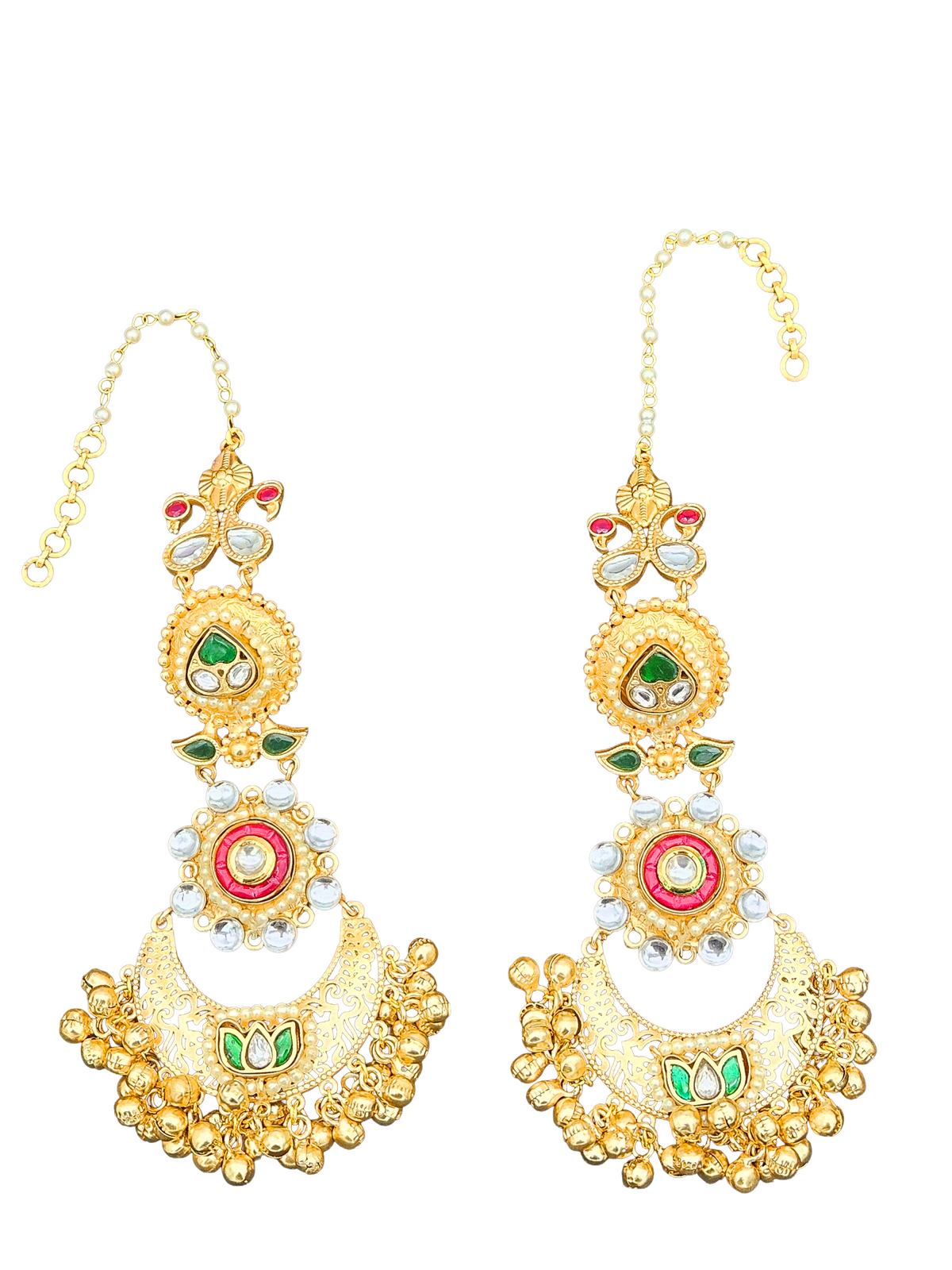Elegant Antique Gold Long Kundan-Polky-Red Glass Stone Motif- Pearl Dangle Earring with Ear Chain