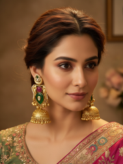 "So Beautiful! Elegant Antique Gold plated Green & Magenta Onyx -Multi Color Glass Polki Jhumka Earrings for women are made of brass alloy. The Earring length & width is 10 cm & 4 cm respectively The Earring weight is 74.3 Gram with Push Back closure. This unique Gold-plated Brass Cute Designer Jhumka Earring are meticulously handcrafted by a Team of skilled Artisan in the heart of India. Simple and comfortable to wear. Eye-catching stylish Earring. The Earrings can be combined with a variety of styles apparel. A great accessory to increase your charm. Good gift for your friends. This is our original Jewellery.