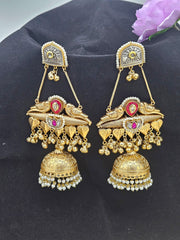 Awesome antique gold Jhumka Earring for women are made of brass alloy with gold plating. The earrings length is 14 cm and the width is 6.5 cm. The closing lock is push back.