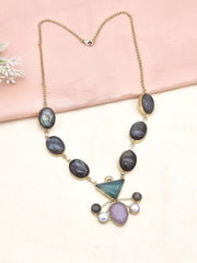 "So Beautiful! Gorgeous Gold plated Labradorite-Chalcedony-Rose Qtz.-Pearl Light Weight Statement Necklace is made of Brass alloy. The Necklace drop length is 30 cm and the weight is 52 Gram. The Necklace length is fixed.