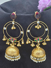 Gorgeous Antique Gold Red Color Stone with Red, Green & White Glass Motif-Synthetic Polky-Pearl Circular Designer Jhumka Earring for women are made of brass alloy. The earrings length is 11.5 cm and the width is 5.8 cm. The closing lock is push back.