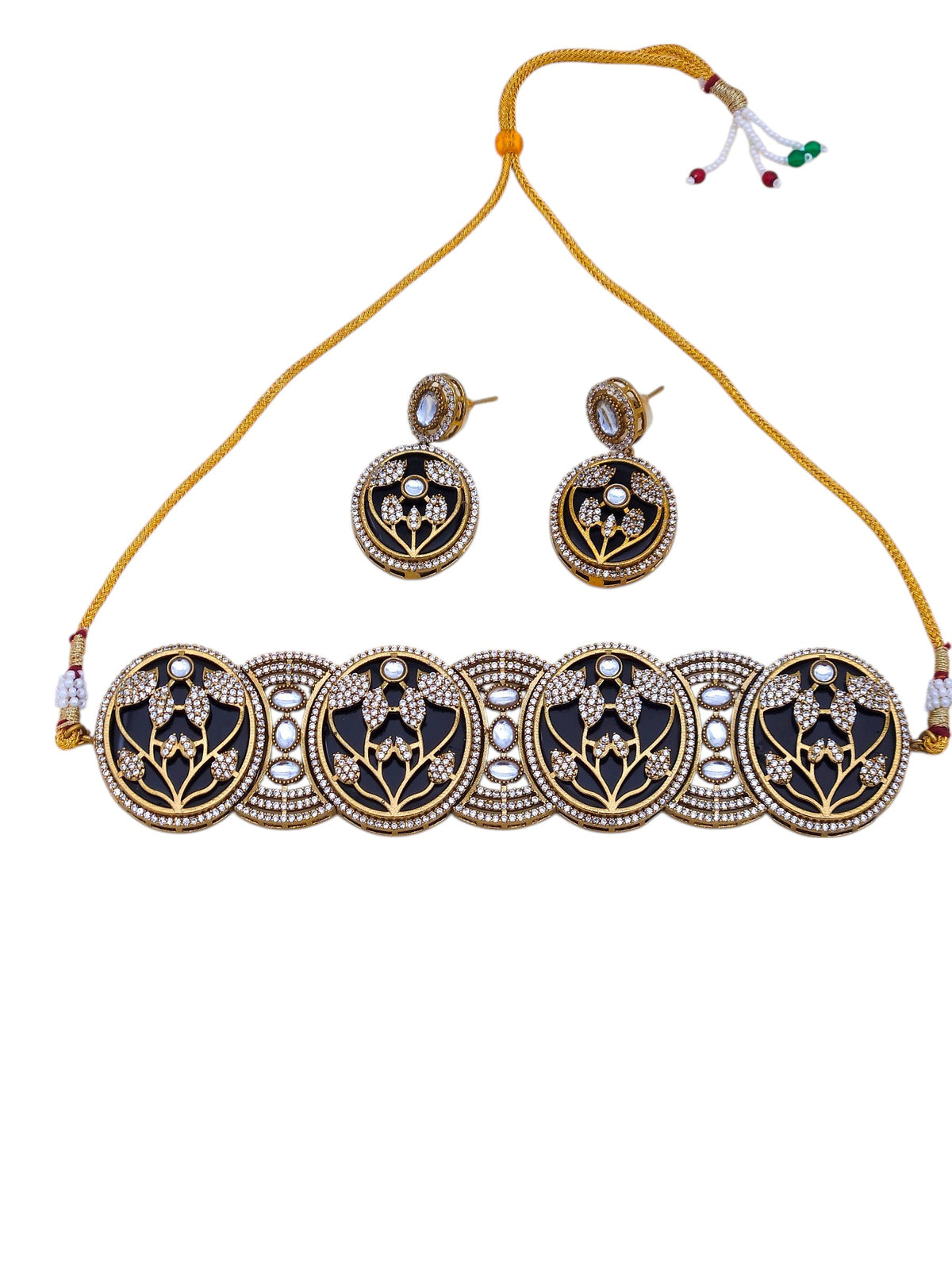 "This Amazing Antique Gold plated AD- Polky Charming Designer Party Wear Choker Necklace-Earring Set for women is made of brass alloy with gold plating. The necklace length is 16 cm. The Necklace-Earring weight is 112 Gram with Drawing String Closure. The Earring Length is 4.5 cm with Push Back Closure.