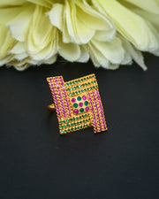 This Stunning Antique Gold Ring is made of brass alloy with gold plating studded with Green & Red Hydro Quartz stones. The Ring Size is US 7 Adjustable. Ring Weight : 6.8 Gram.