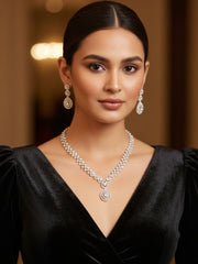 "Stunning Designer Rhodium plated Necklace-Earring Set is made of 70% silver. The Necklace length is 27 cm adjustable. The Earring length & width is 3.5 x 1.5 cm respectively. The weight of the Necklace-Earring Set is 36.8 Gram. The necklace is adjustable as it has an Adjustable Chain with extra rings. This Stunning Rhodium plated Statement Necklace-Earring Set is a show-stopping, traditional Indian necklace with Rhodium plating and handwork.