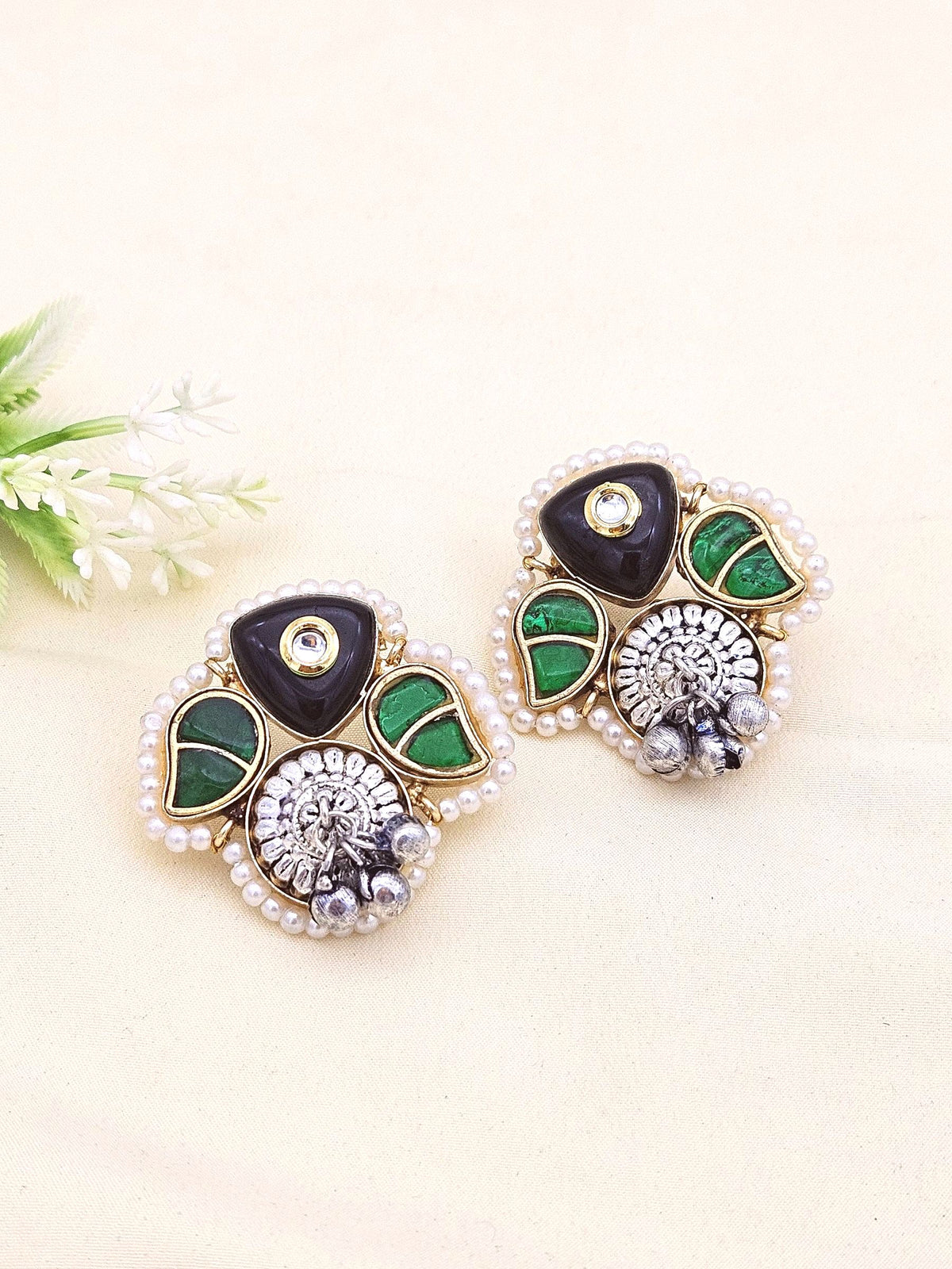 "So Beautiful! Elegant Antique Gold-Silver Oxidized Kundan Polky-Black & Green Glass Stone-Pearl Stud EarringS for women are made of brass alloy. The Earring length & width is 4 cm each. The Earring weight is 27 Gram with Push Back closure. This unique Gold-plated Brass Cute Designer Earring are meticulously handcrafted by a Team of skilled Artisan in the heart of India. Simple and comfortable to wear. Eye-catching stylish Earring. The Earrings can be combined with a variety of styles apparel. A great accessory to increase your charm. Good gift for your friends. This is our original Jewellery.