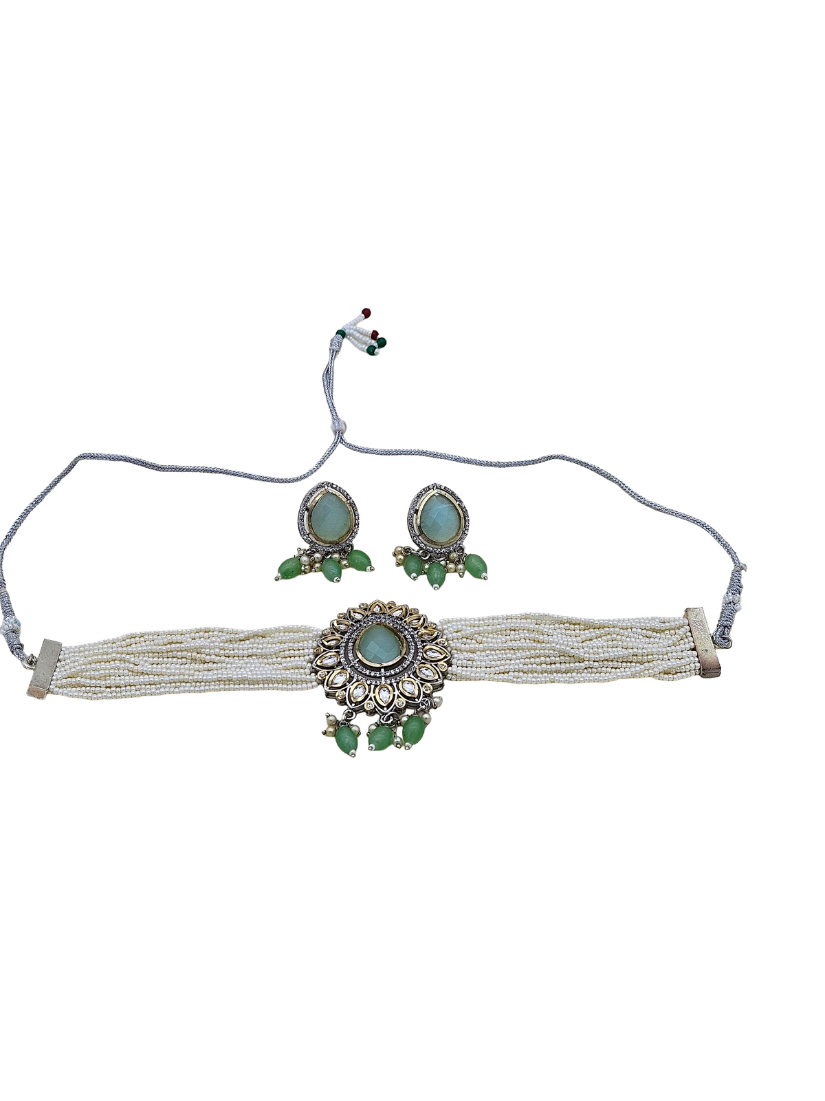 "Charming Antique Gold plated AD-Faux Kundan Glass Polky- Monalisa Stone -Pearl-Green Glass Beads Designer Choker Necklace-Earring Set for women is made of brass alloy with gold plating. The necklace length is 22.5 cm. The Necklace-Earring weight is 58.6 Gram with Drawing String Closure. The Earring Length is 4 cm & Width is 1.8 cm with Push Back Closure. This Antique gold Choker Necklace-Earring Set is a show-stopping, traditional Indian necklace with gold plating and handwork.