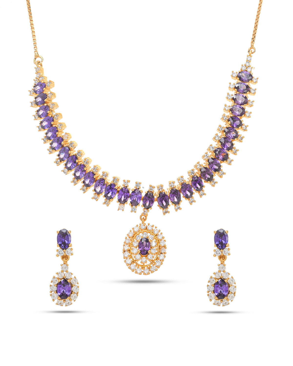 Antique Gold Cubic Zirconia-Amethyst Hydro Quartz Gem Stones statement necklace is made of brass alloy with gold plating. The necklace length is 18 cm, and is adjustable with extra Rings for adjustment. The necklace weight is 47 Gram with S-Hook for closure.