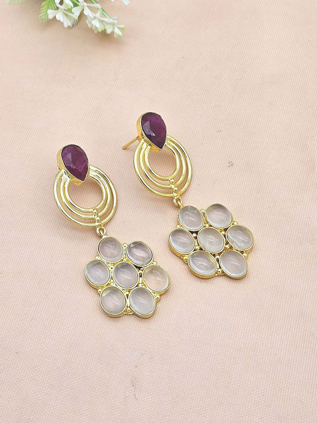 Stunning Gold Plated Red Hathipara-Rose Quartz Stone Floral Designer Dangle Drop Earrings for women are made of brass alloy. The earrings length, width & weight measurements are as given in the product details above. The closure lock is Push Back.